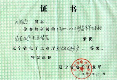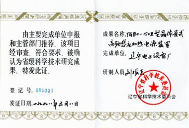 TG80C-150Ⅱ型晶體管式高頻感應(yīng)加熱電源裝置榮獲一九九八年遼寧省電子工業(yè)廳科技進(jìn)步一等獎(jiǎng)。